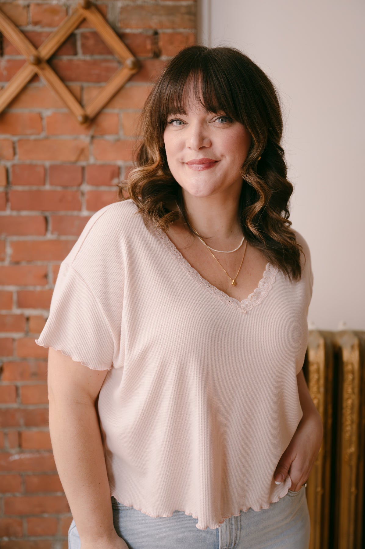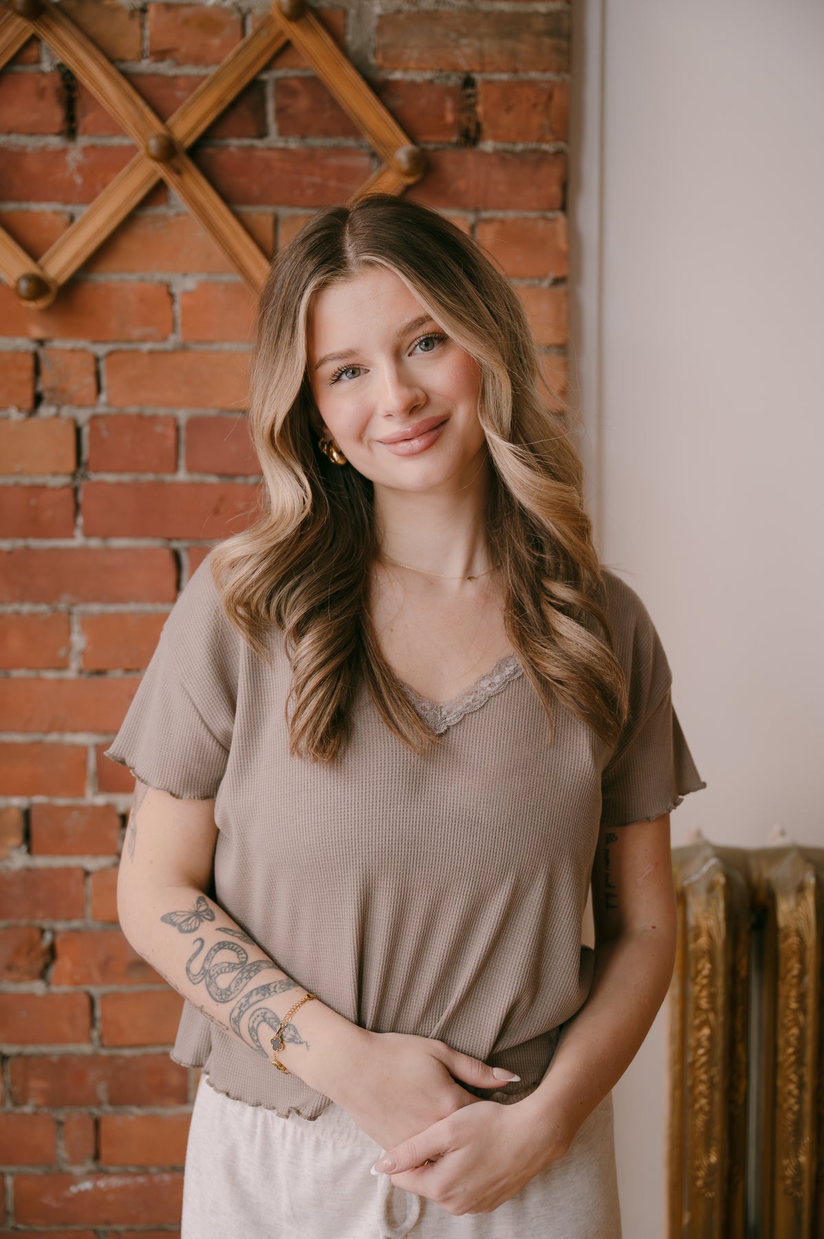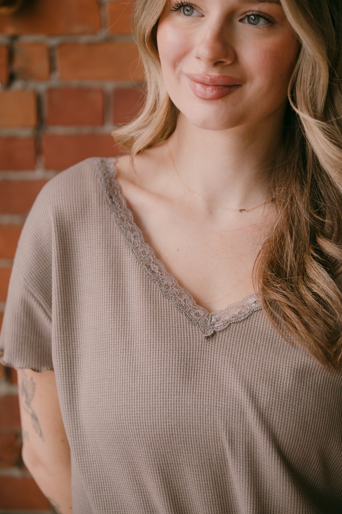 Effortless elegance meets everyday comfort in this Swift Lace Trim Waffle Top. The delicate lace detailing at the neckline and sleeves adds a touch of refined femininity, while the soft heathered mocha hue works seamlessly with your existing wardrobe.