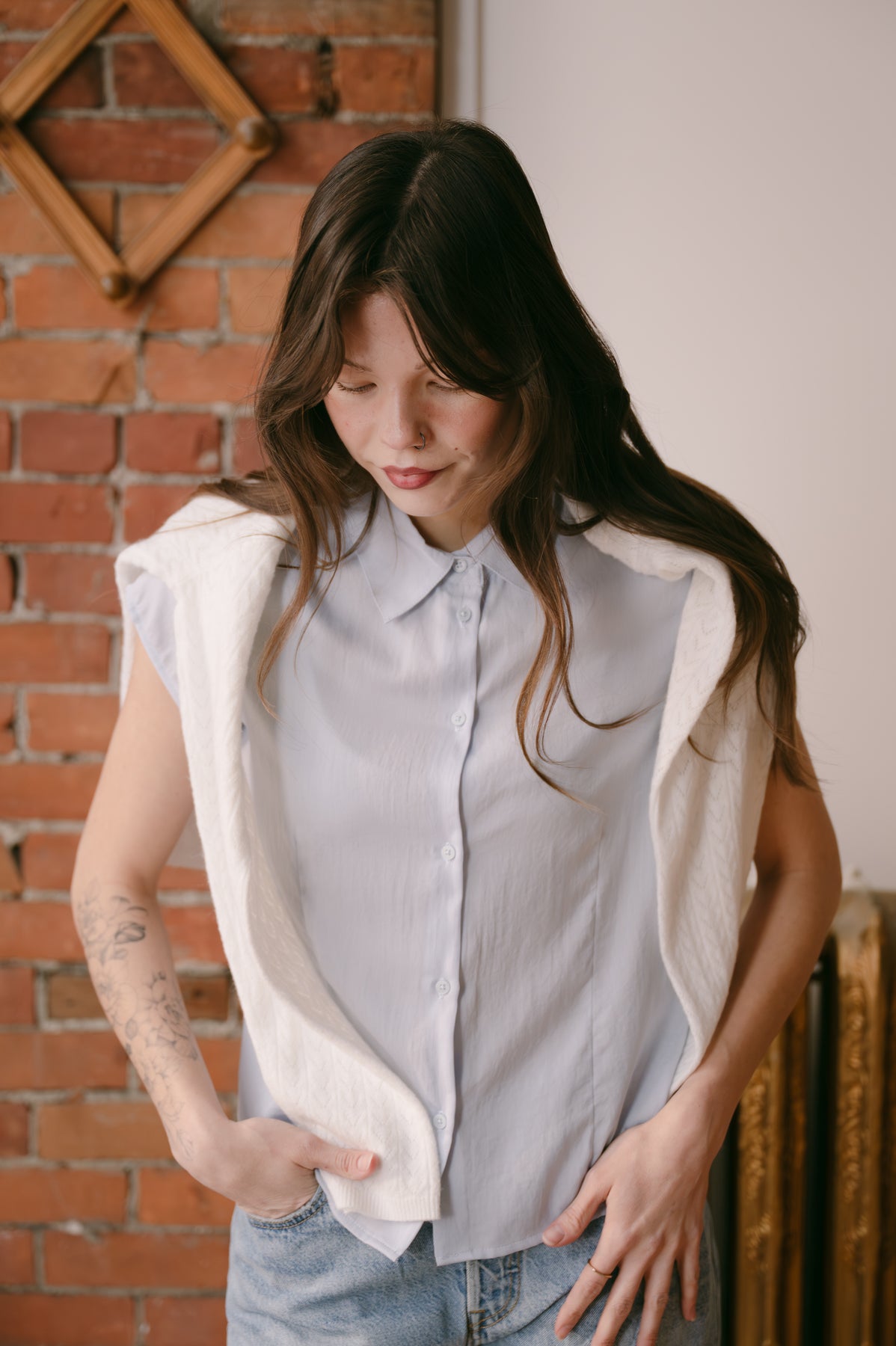 Cut in a regular fit that flatters without clinging, this sky blue essential pairs beautifully with tailored trousers, denim, or skirts.