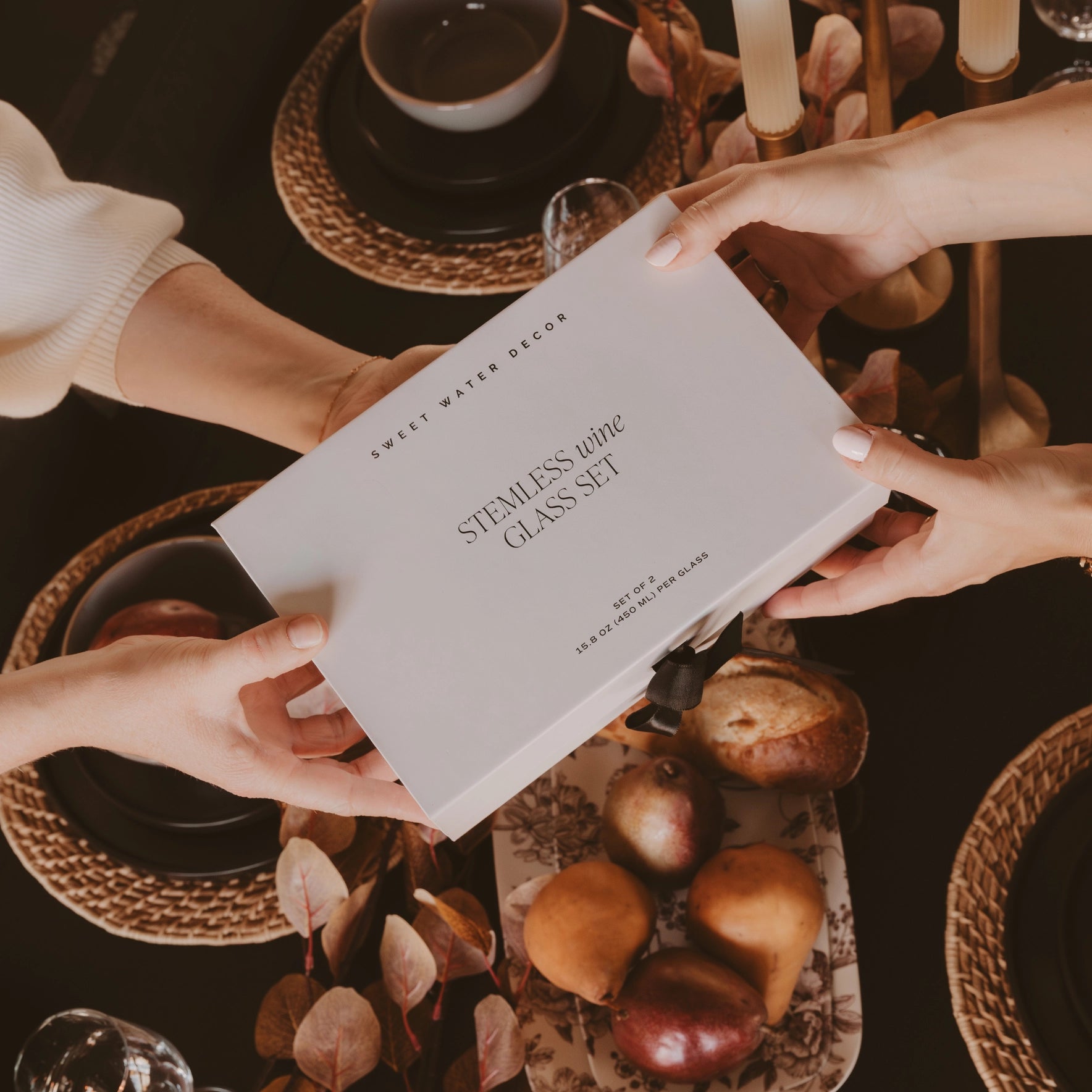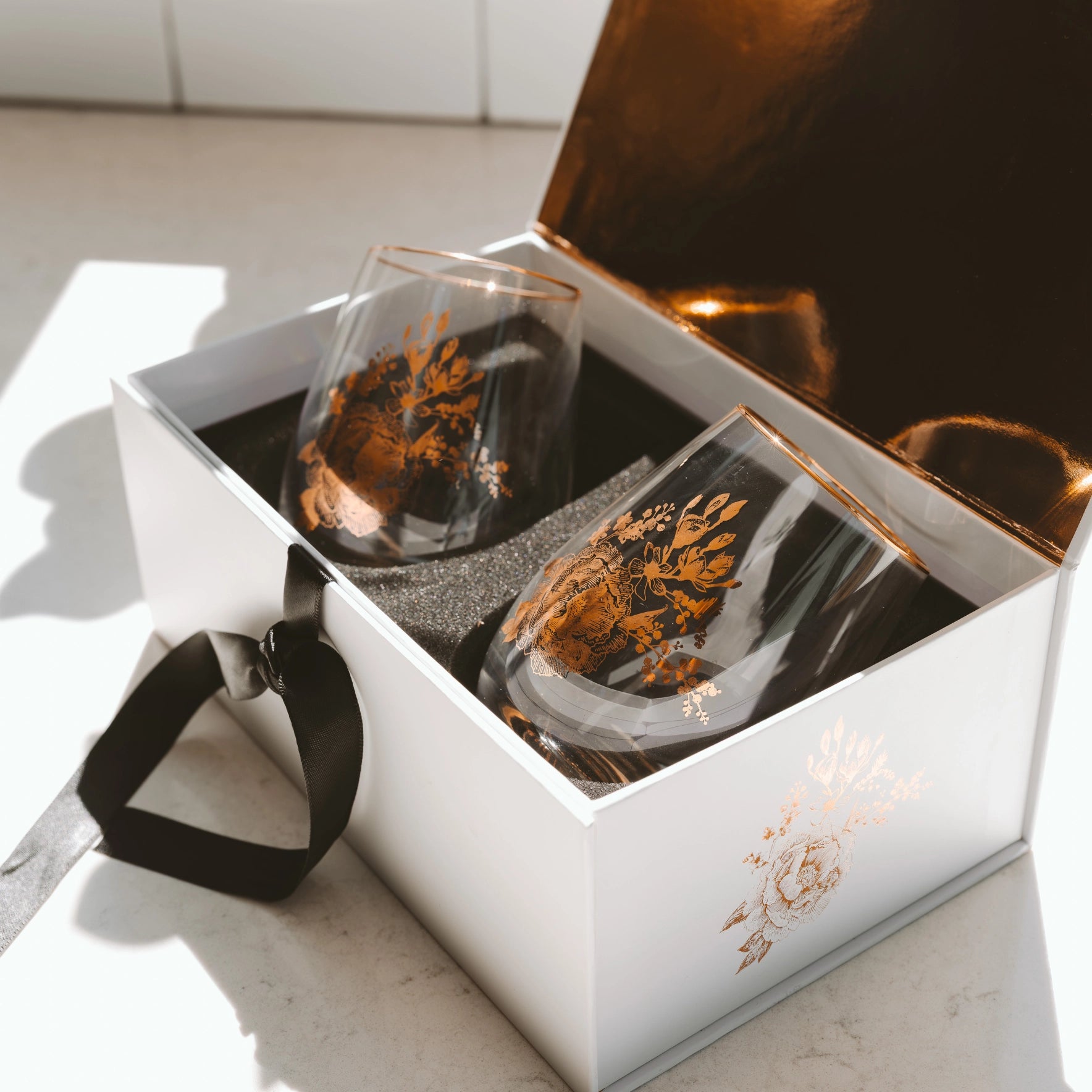 Elevate your seasonal assortment with our Boxed Set of 2 Stemless Wine Glasses, featuring a timeless Delft-inspired design and delicate gold floral details. Beautifully packaged in a premium gift box with a satin ribbon tie, this set is perfect for Fall gatherings, Thanksgiving tables, and Autumn hostess gifts. A versatile, elegant addition your customers will love all season long.