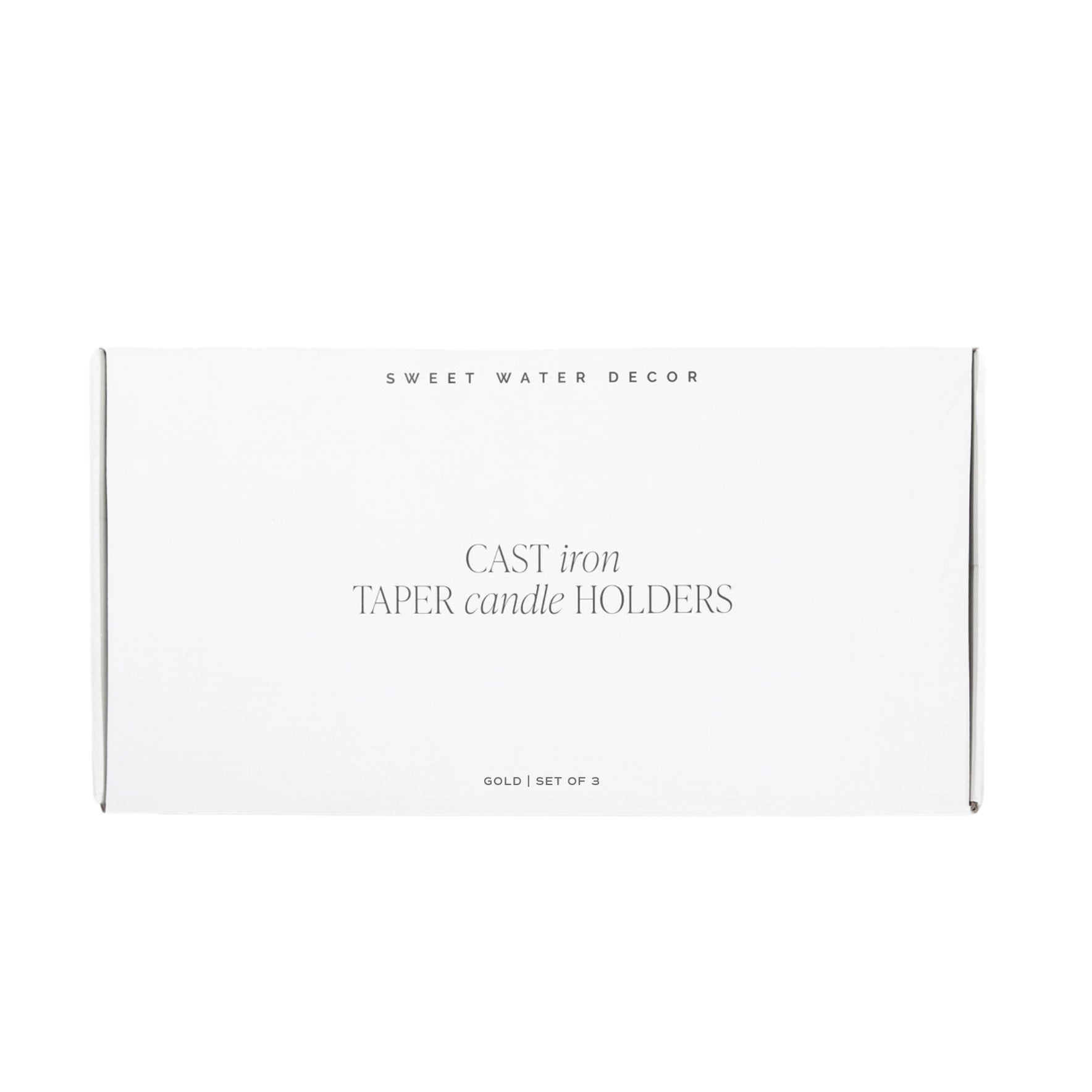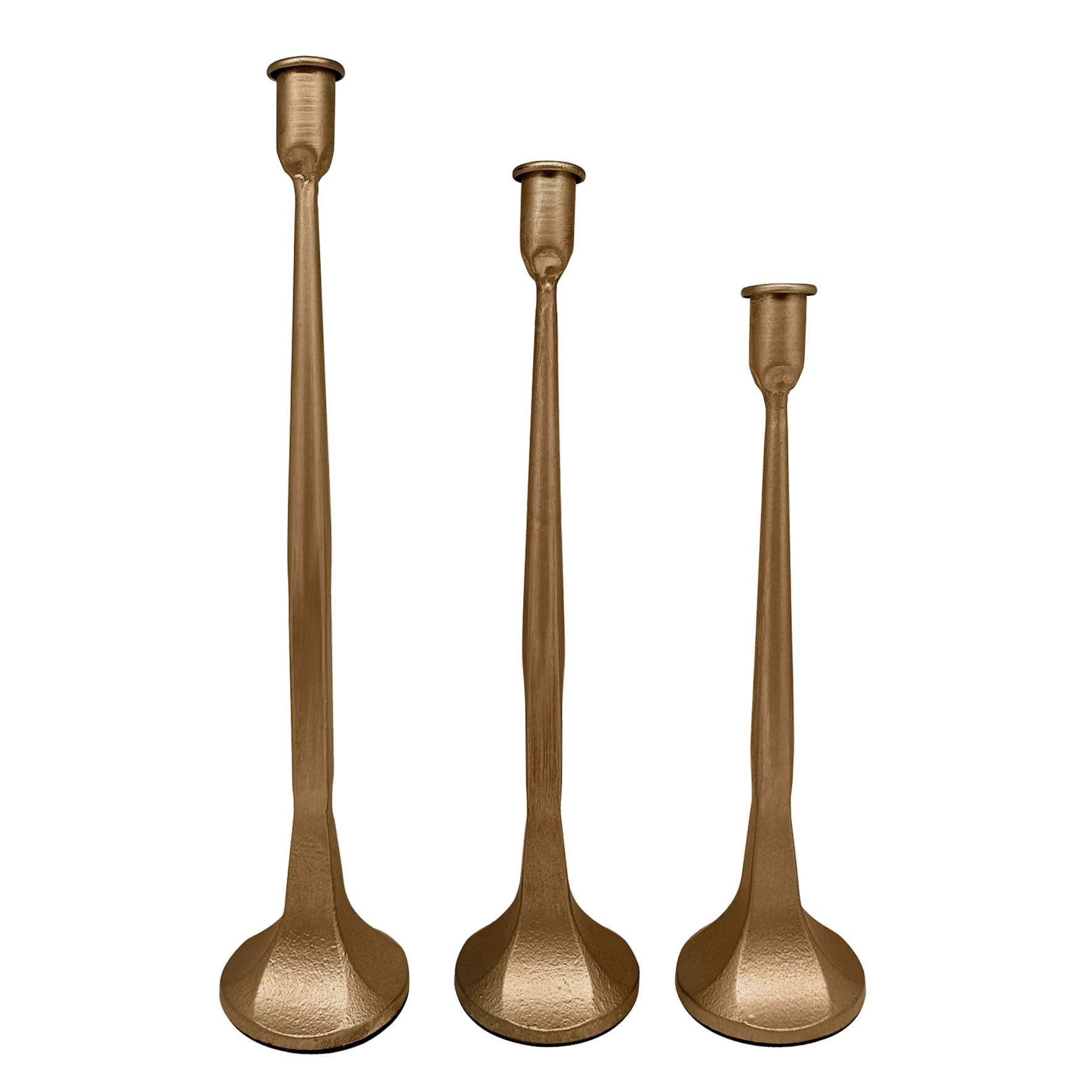 ITEM DETAILS: • Set of 3 • Cast Iron • Gold • Dimensions: Small: 3.35" x 12" Medium: 3.35" x 14" Large: 3.35" x 15.5" • Candles not included • Package Dimensions: 17.25" x 5" x 5"