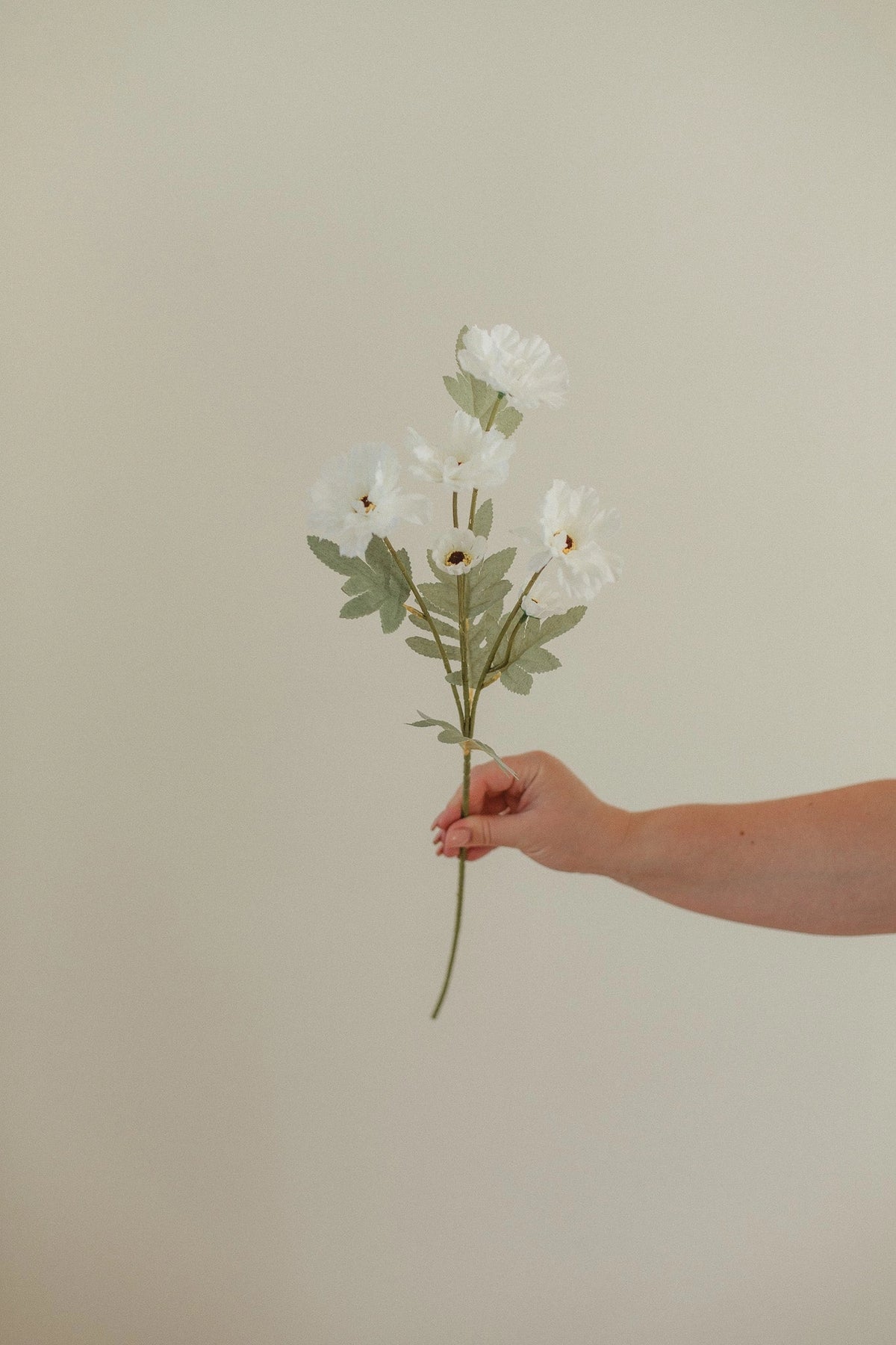 Specifications: - White with pink tones, Soft Pink flower, brown stem - 21.5" stem - Large, full bloom - Silk and plastic materials - Uniquely textured petals -Removable blooms - Steaming recommended