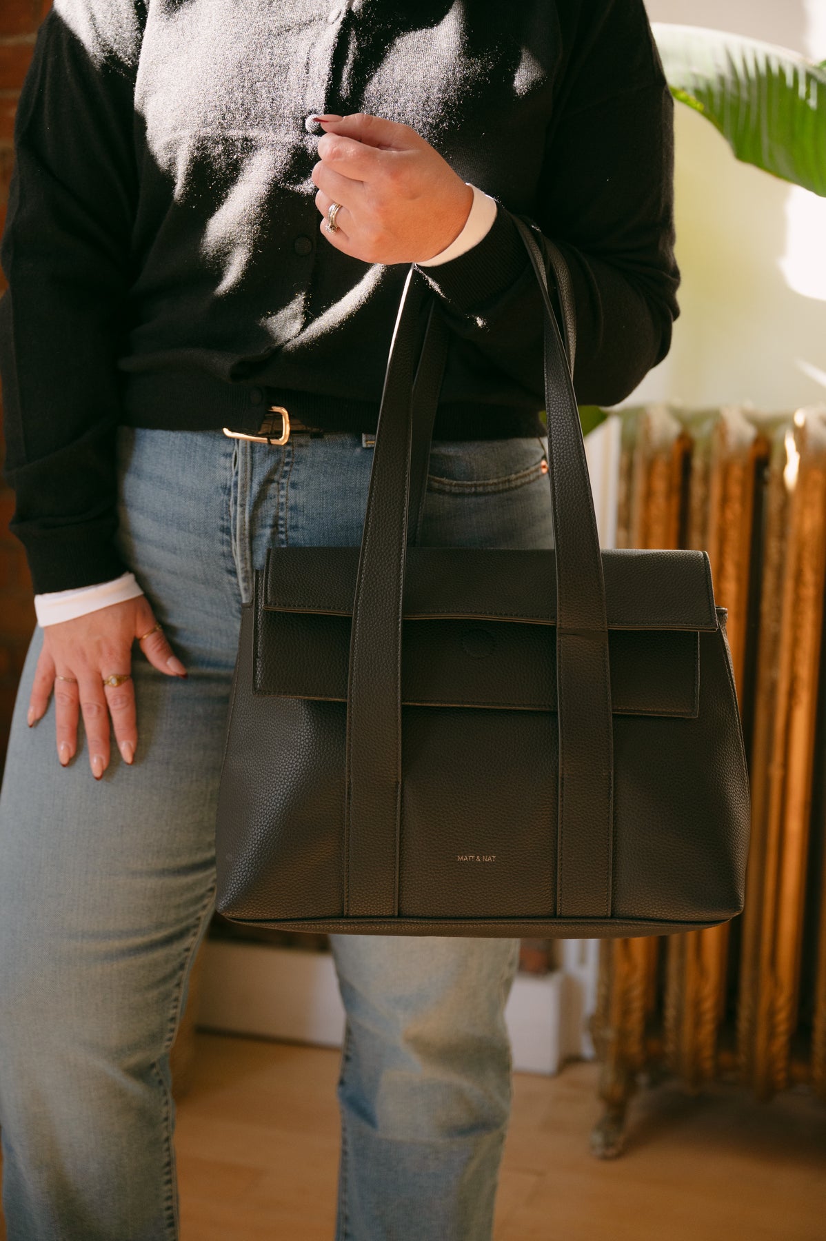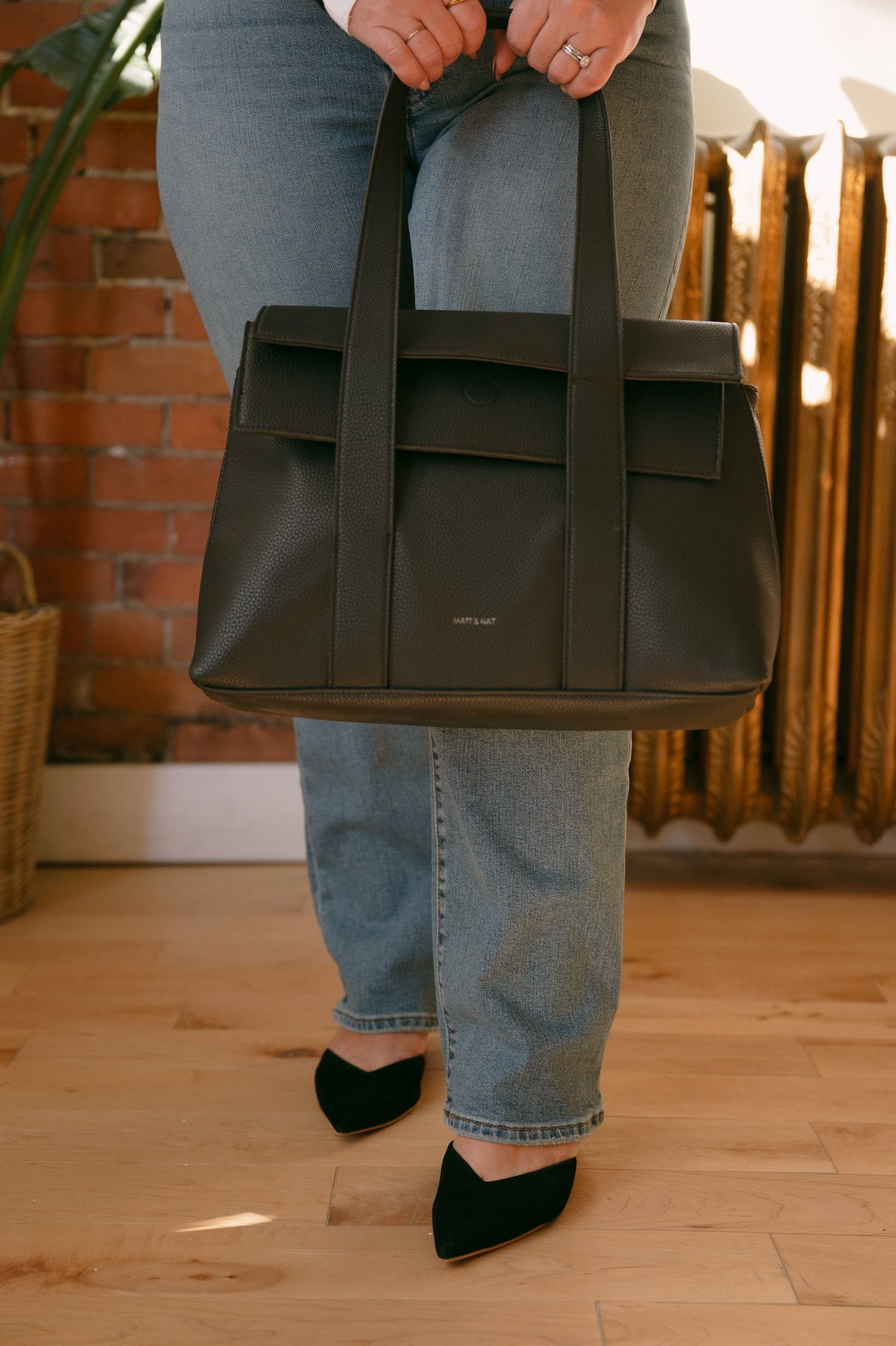 The material of this bag is made from 58% recycled content. The interior lining of our bags are made from 100% recycled plastic bottles.