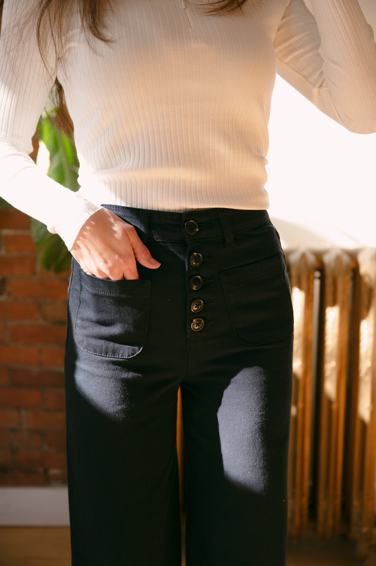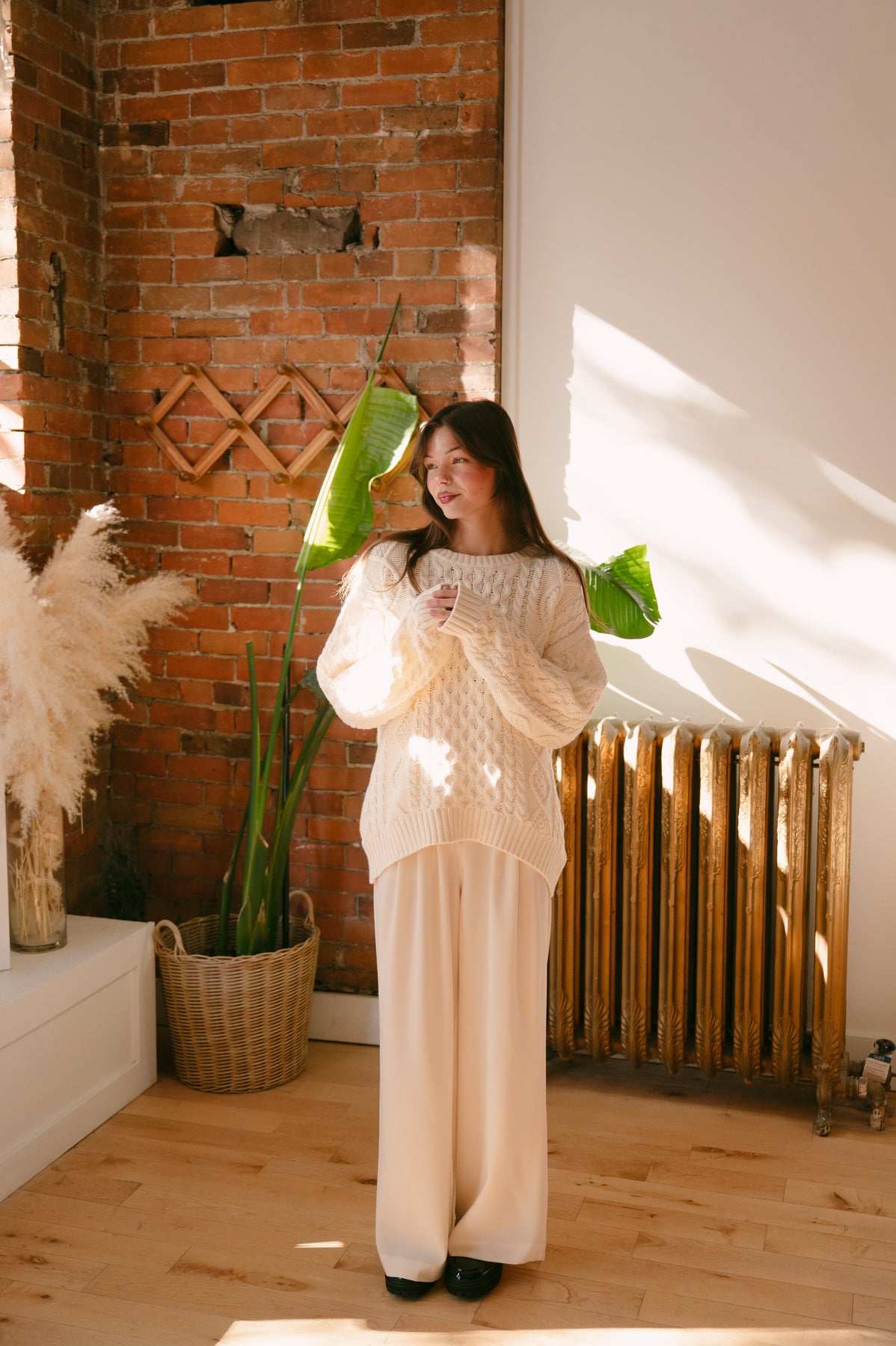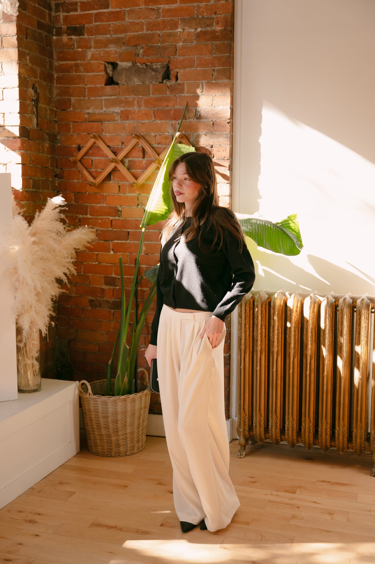 Discover the Wilma Wide Leg Pant in a beautiful ecru shade, designed to move with you. These high-waisted pants feature a playful, flowy silhouette that adds effortless elegance to any outfit. The single button closure at the front pairs perfectly with a comfortable elasticized waistband at the back, giving you just the right fit while keeping things stylishly simple. Perfect for breezy days or chic evenings, these pants are all about combining comfort with a dash of flair.