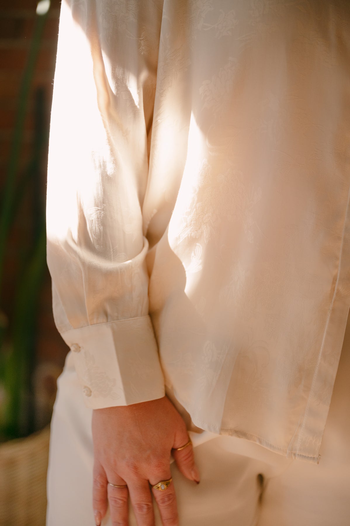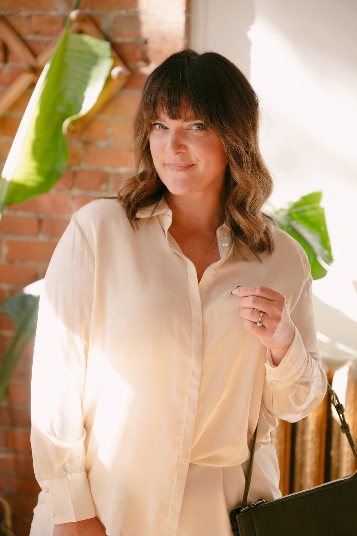 Step into elegance with the Felicity Floral Jacquard Blouse in ivory. This playful piece features a button-up front and charming cuffed sleeves, adding a touch of sophistication to your look. Its silky satin-like feel promises comfort while the floral jacquard pattern brings a fresh, feminine vibe perfect for any occasion.