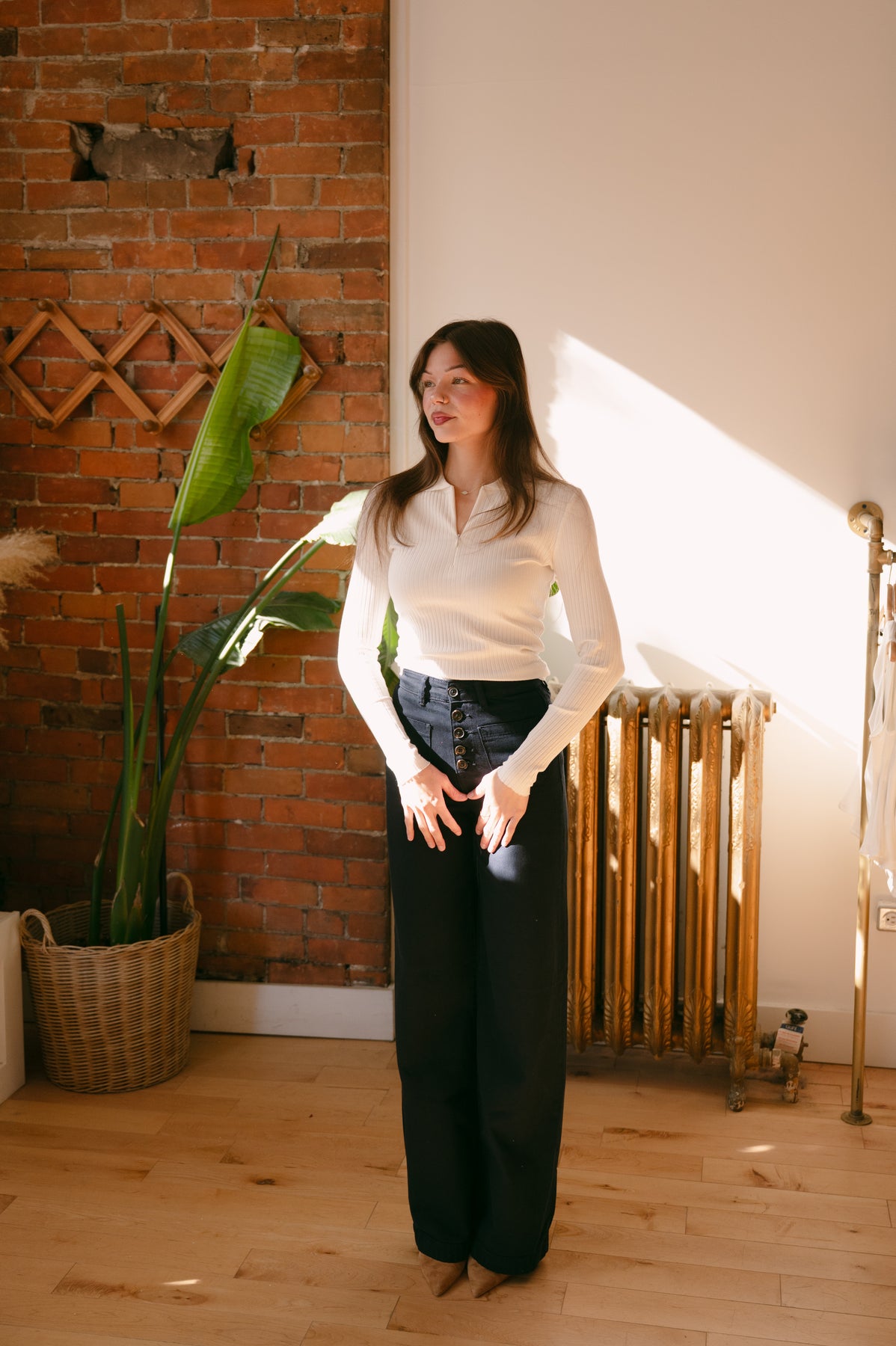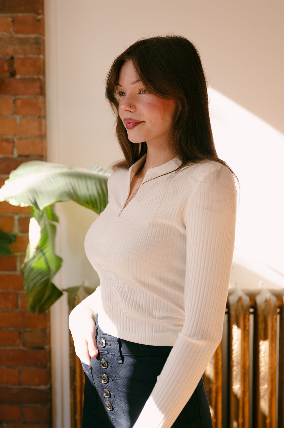 Stay cozy and cute in the Hillary Half Zip Top – Ivory. Made from soft, stretchy ribbed fabric, it hugs you just right while keeping things comfy. The playful half zip and collar add a fun twist, and long sleeves make it perfect for layering or solo style. Perfect for days when you want to feel comfy but look effortlessly chic!