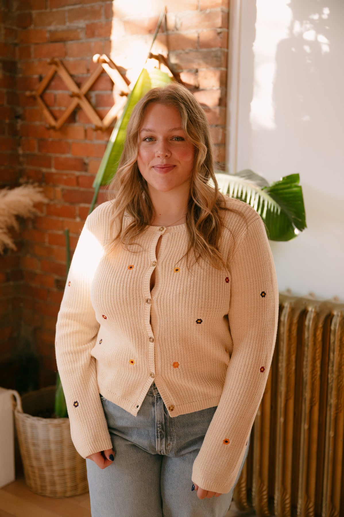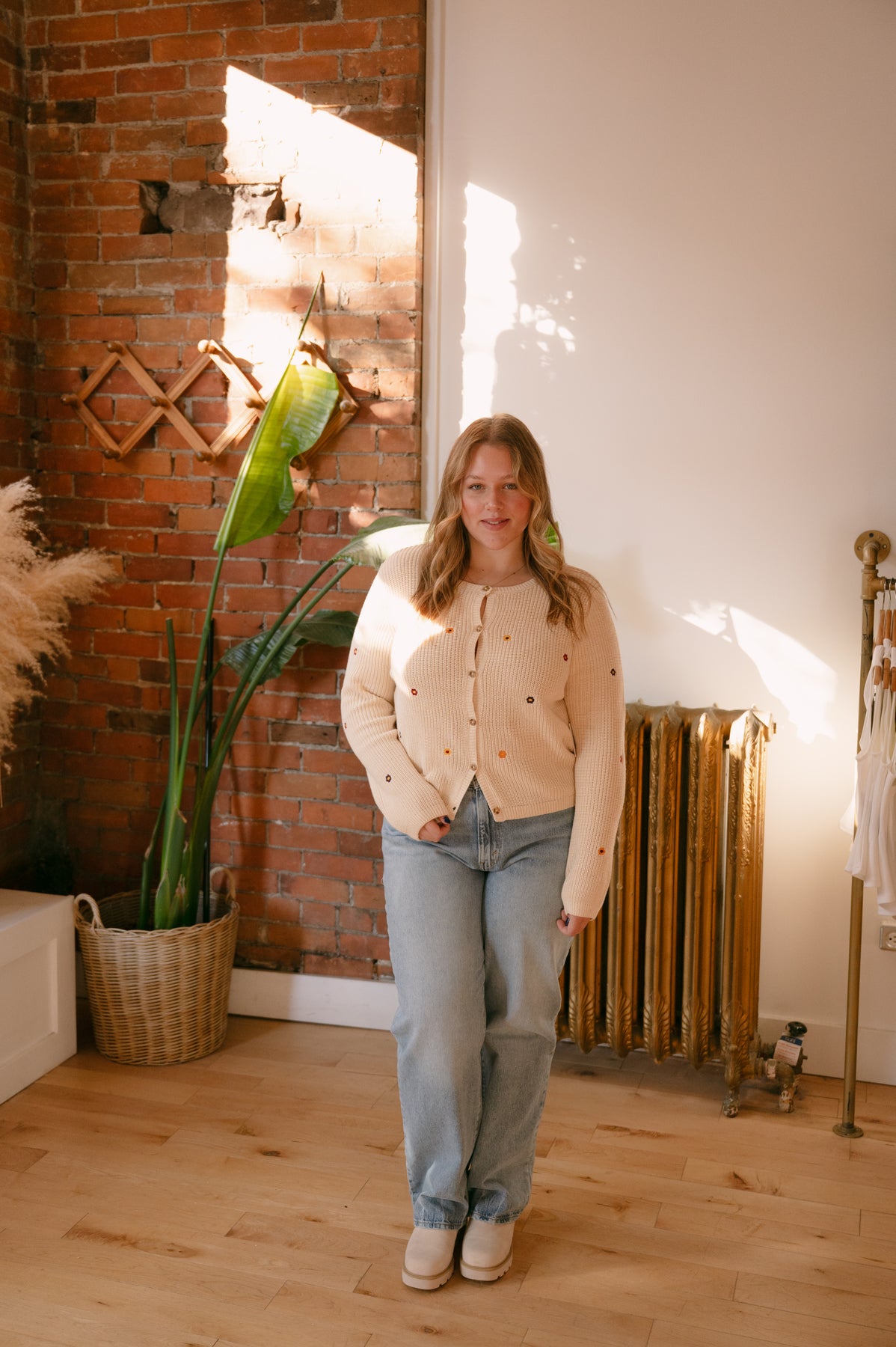 Cozy up in the Eliza Embroidered Cardigan, featuring a playful ribbed texture and charming small floral embroidery. Its crew neck and long sleeves offer classic comfort with a whimsical twist, perfect for adding a touch of sweet style to any outfit.